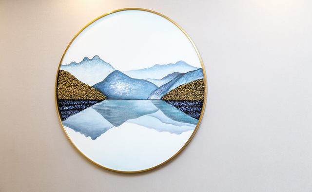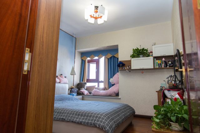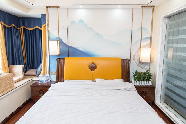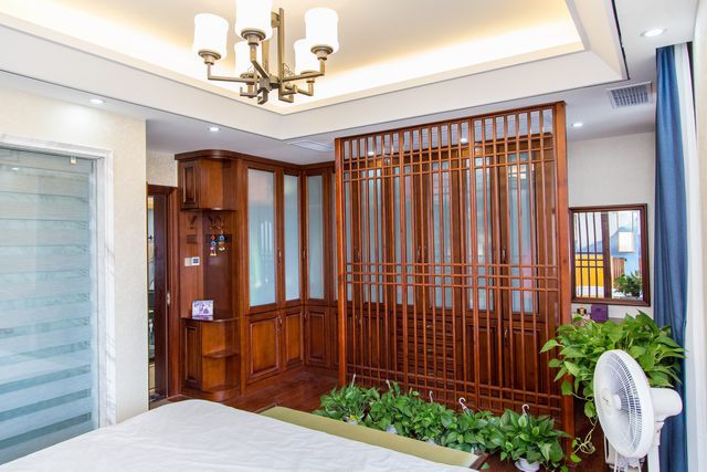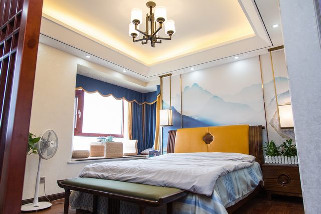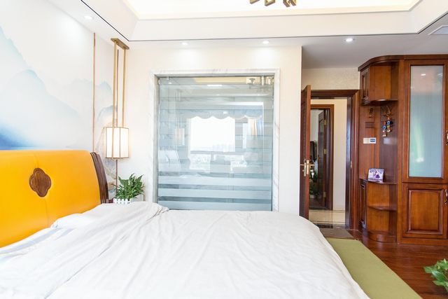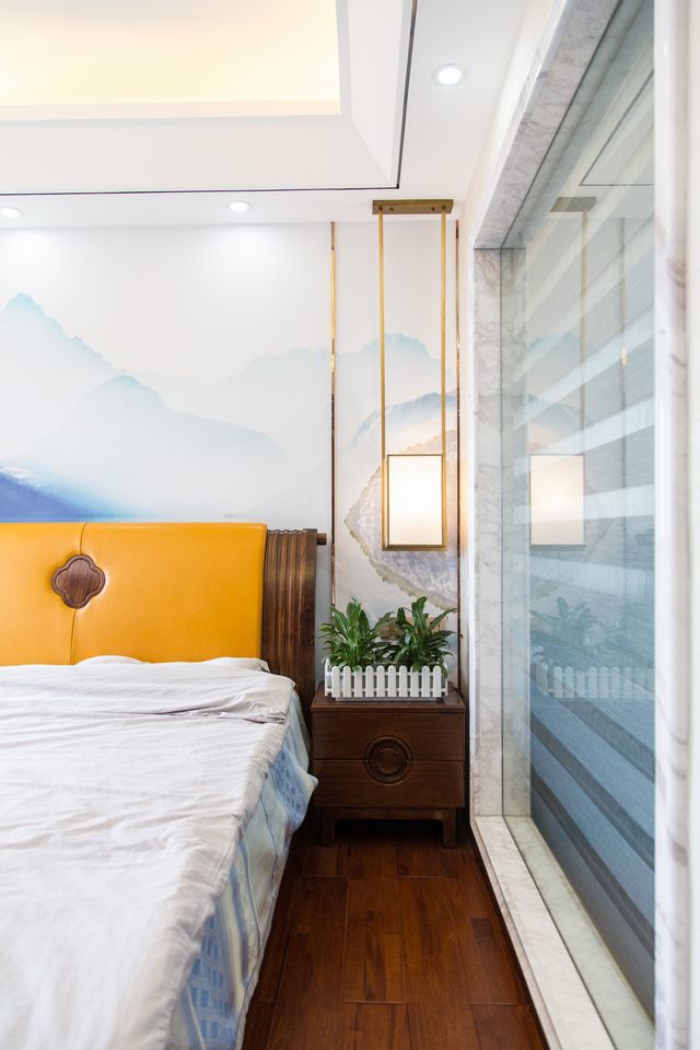 主臥室是一個擁有南北雙向?qū)α鞯目臻g,寬敞明亮,采光優(yōu)越,然而設(shè)計師認為這并不適合私密空間的打造,于是為屋主設(shè)計了一個半開放式的衣帽間,把空間不刻意地分隔為兩個相對獨立的空間,又保證了光線的引入,室內(nèi)空間與光影的結(jié)合讓人感覺溫馨且愜意,以暖和色系如玫瑰金、藍色、山水畫等,營造東方寫意,天花摒棄傳統(tǒng)裝飾元素,透過玻璃及黑金屬燈飾以幾何造型呈現(xiàn),引入自然光線,室內(nèi)外相互緊扣的光與影,于室內(nèi)也能擁抱自然氣息。