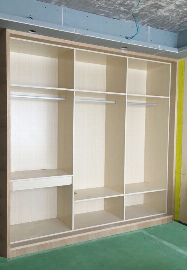 現(xiàn)場制作衣柜,內(nèi)結構實木免漆板、外框雙層板工藝讓柜體更牢固,不變形,再貼面板,實木線收邊